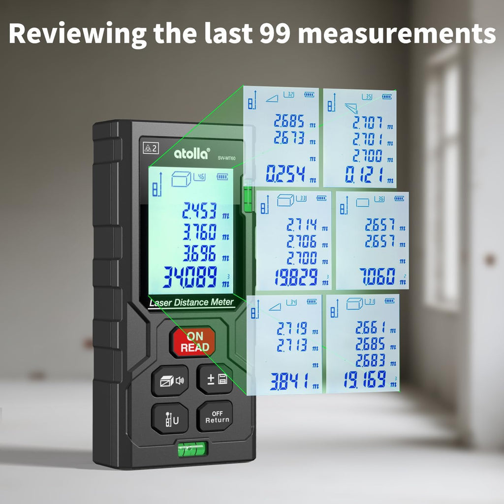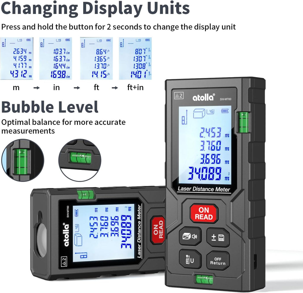 atolla 60m Laser Distance Range Finder with Bubble Level and Large LCD Backlit (SW-MT60)